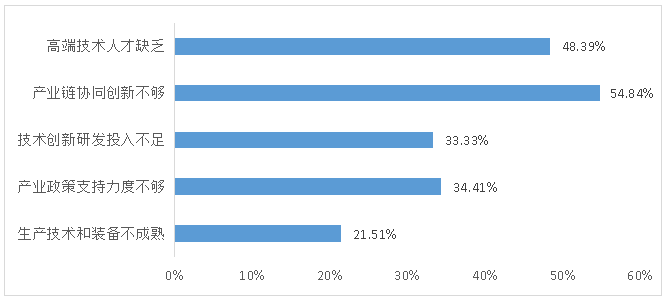 3. 当前制约行业科技创新的原因很多,但相对集中。调查问卷显示,54.84%的样本企业认为是产业链协同创新不够,48.39%的样本企业认为是高端技术人才缺乏(图8),这两项都占比较高,也侧面反映出行业进一步推动科技创新的两个着力点。另外,认为产业政策支持力度不够的占34.41%,技术创新研发投入不足的占33.33%。