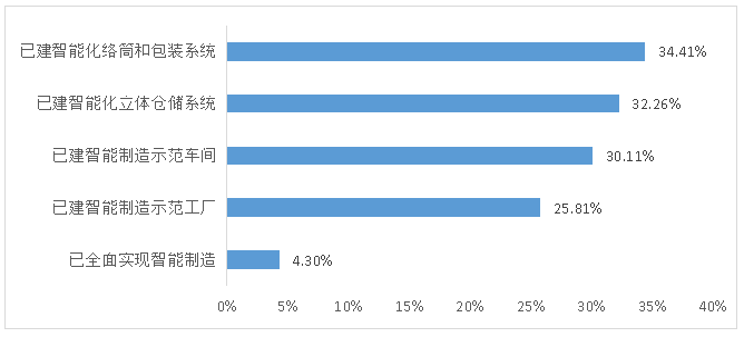 5. 化纤行业智能制造已取得许多成绩。对于行业智能制造水平情况,被调研企业间表现出较大差异。调研问卷显示,化纤行业智能制造目前仍主要体现在建立自动络筒包装系统、立体仓储系统,以及建立智能制造示范车间和示范工厂的阶段。其中,已建智能制造示范工厂的样本企业占25.81%,已建智能制造示范车间的样本企业占30.11%,已建智能化立体仓储系统的样本企业占32.26%,已建智能化络筒和包装系统的样本企业占34.41%(图9)。需要特别说明的是,其中选择全面实现智能制造的企业有4家,可能是由于填表人对于“全面实现智能制造”的理解有出入而造成的误填。
