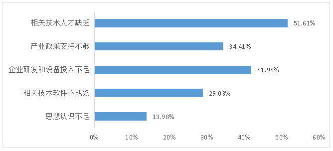 对于当前制约行业智能制造的主要原因,调研问卷显示,51.61%的样本企业认为是相关技术人才缺乏,41.94%的企业认为是企业研发和设备投入不足,34.41%的企业认为是产业政策支持不够,29.03%的企业认为是相关技术软件不成熟,13.98%的企业认为是企业自身思想认识不足。