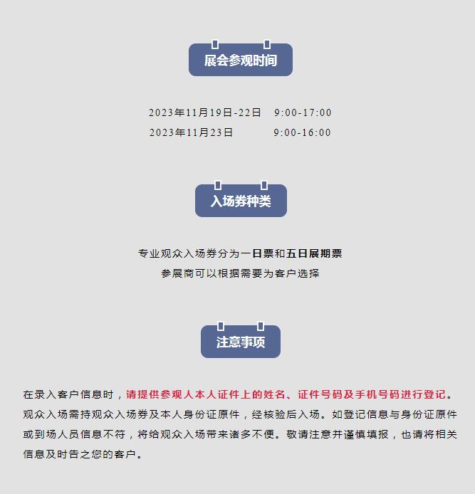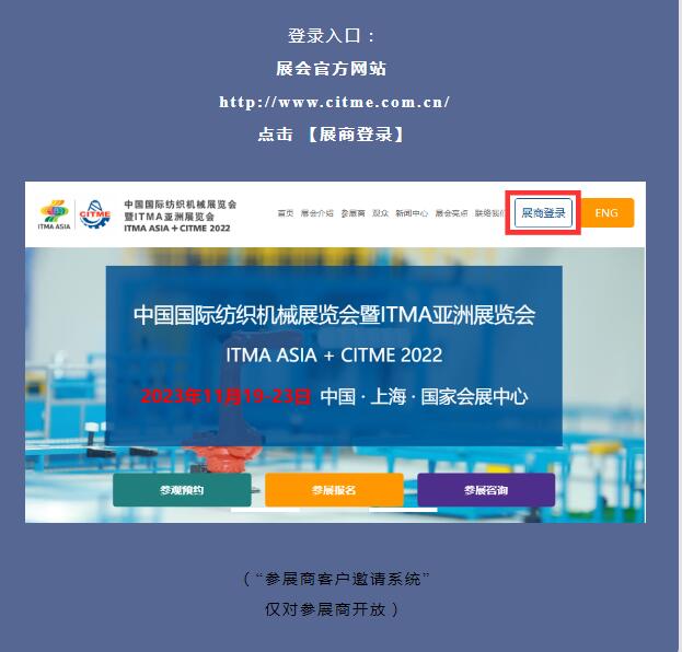 您现在的位置是:首页 > 要闻 @全体参展商,专属邀请函一键送达客户手中 来源:国际纺织机械展览会 发布日期:2023-08-08 字体: 【小】 【中】 【大】 2023年11月19-23日,中国国际纺织机械展览会暨ITMA亚洲展览会(以下简称“展会”)将在国家会展中心(上海)与业界相约。本届展会展出规模超过16万平方米,参展商数量将超过1400家,来自意大利、德国、瑞士、日本、韩国、比利时、印度等24个国家和地区。 目前,展会组委会正在紧锣密鼓地推进各项筹备工作,包括展会运营服务、宣传推广工作以及海内外专业观众组织工作,旨在为广大参展商、专业观众及业界同仁带来更加优质、高效、安全的参展、观展体验。 为了给广大参展企业邀请客户参观提供更好的服务和便利条件,进一步提升展览会商贸效果、扩大参展企业的影响力,展会组委会继续开通-参展商客户邀请系统,并提供以下尊享票证服务: 凡获得本届展会参展资格的企业,通过“参展商客户邀请系统”为客户申请入场券,相关费用由展会主办方承担。 分享: 热门文章: 2025intertextile春夏 | “友礼”同享齐观展... [2025-02-19] 2024年我国纺织行业经济运行总体平稳 [2025-02-17] 聚焦绿色智慧融合 展示产业用纺织品新趋势 [2025-02-11] 响应政策 落实服务 | PH Value义乌展全力“备战”中 [2025-02-11] 【亮星季】第一期正式开启 | 商贸先行,品质好礼享不停 [2025-02-10] 展会直通车