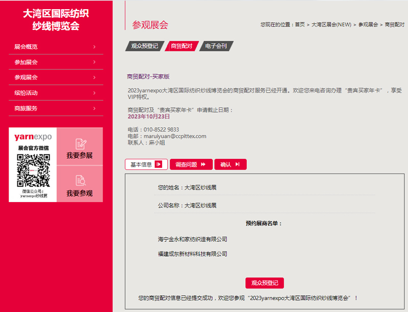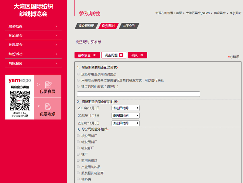 填写并提交您的基本信息及调查问题,主办单位进行后台审核,将有专人与您联系商贸预约具体事宜。主办咨询电话:010-85229833。