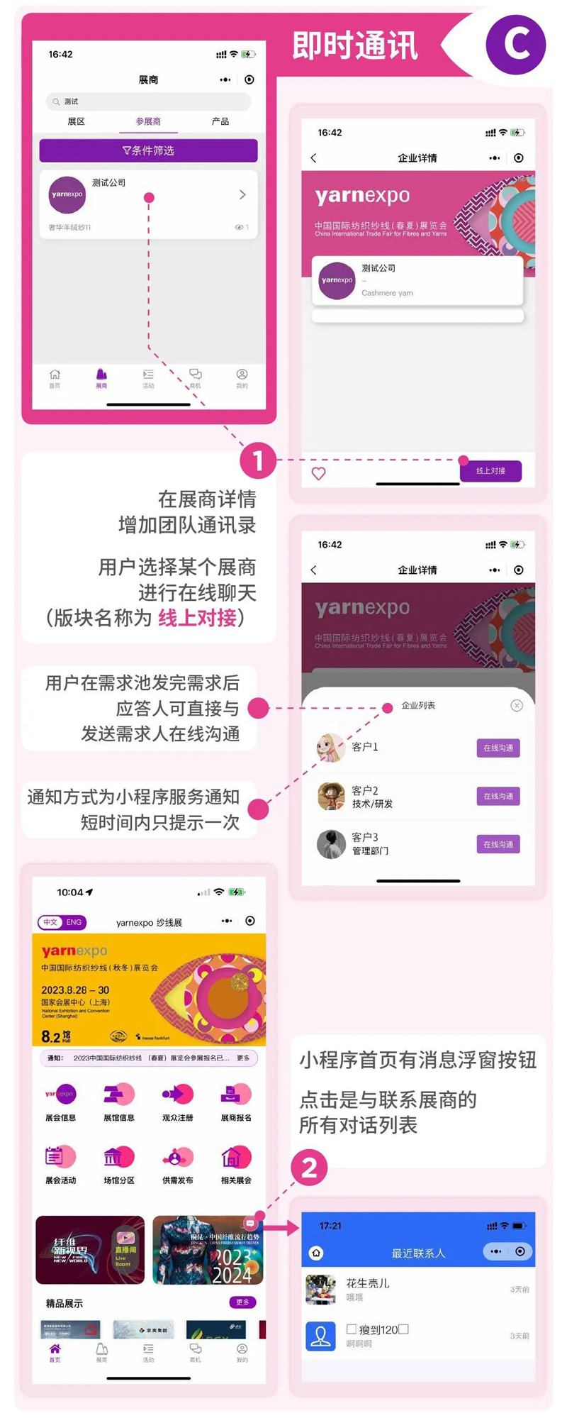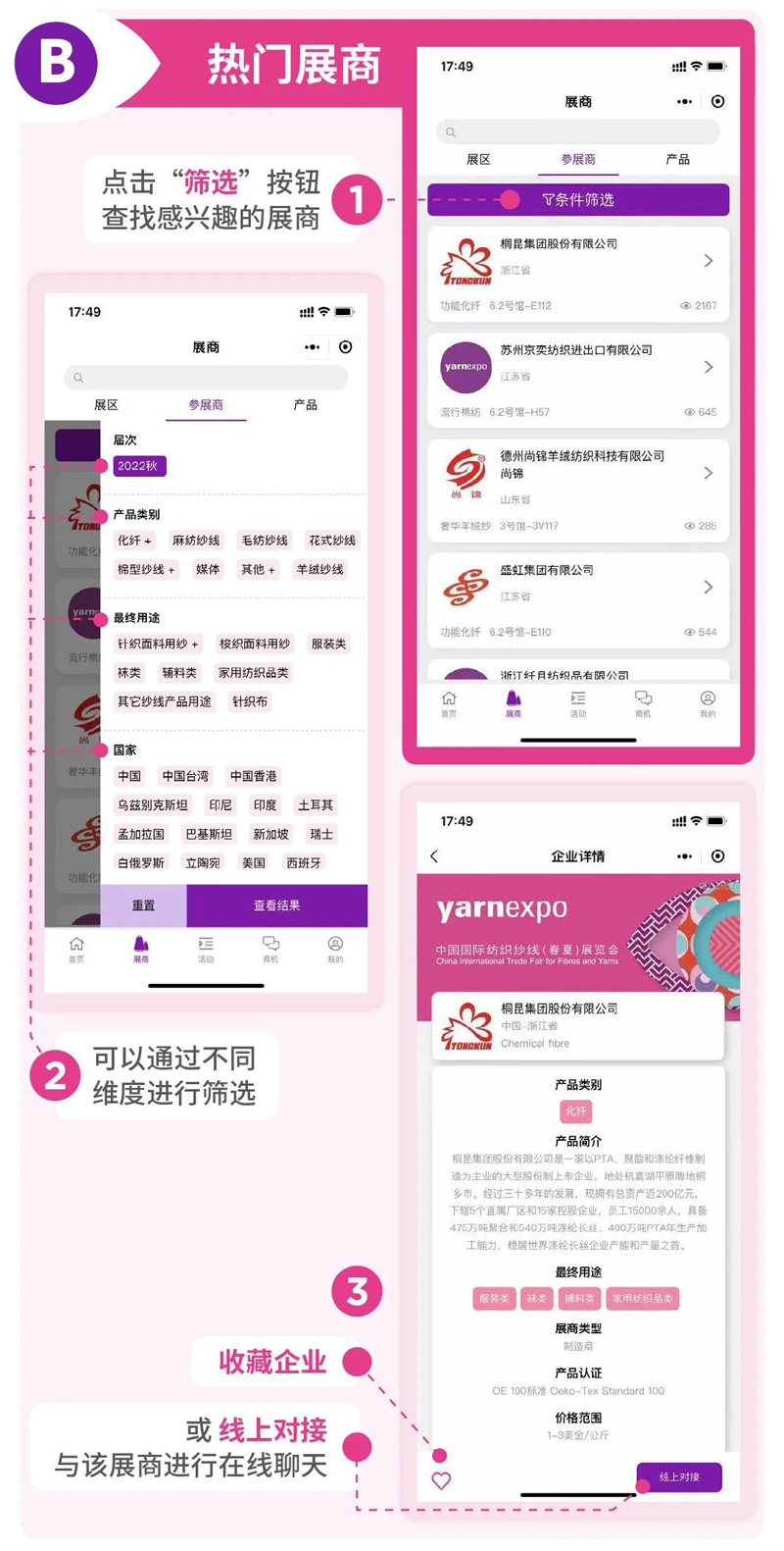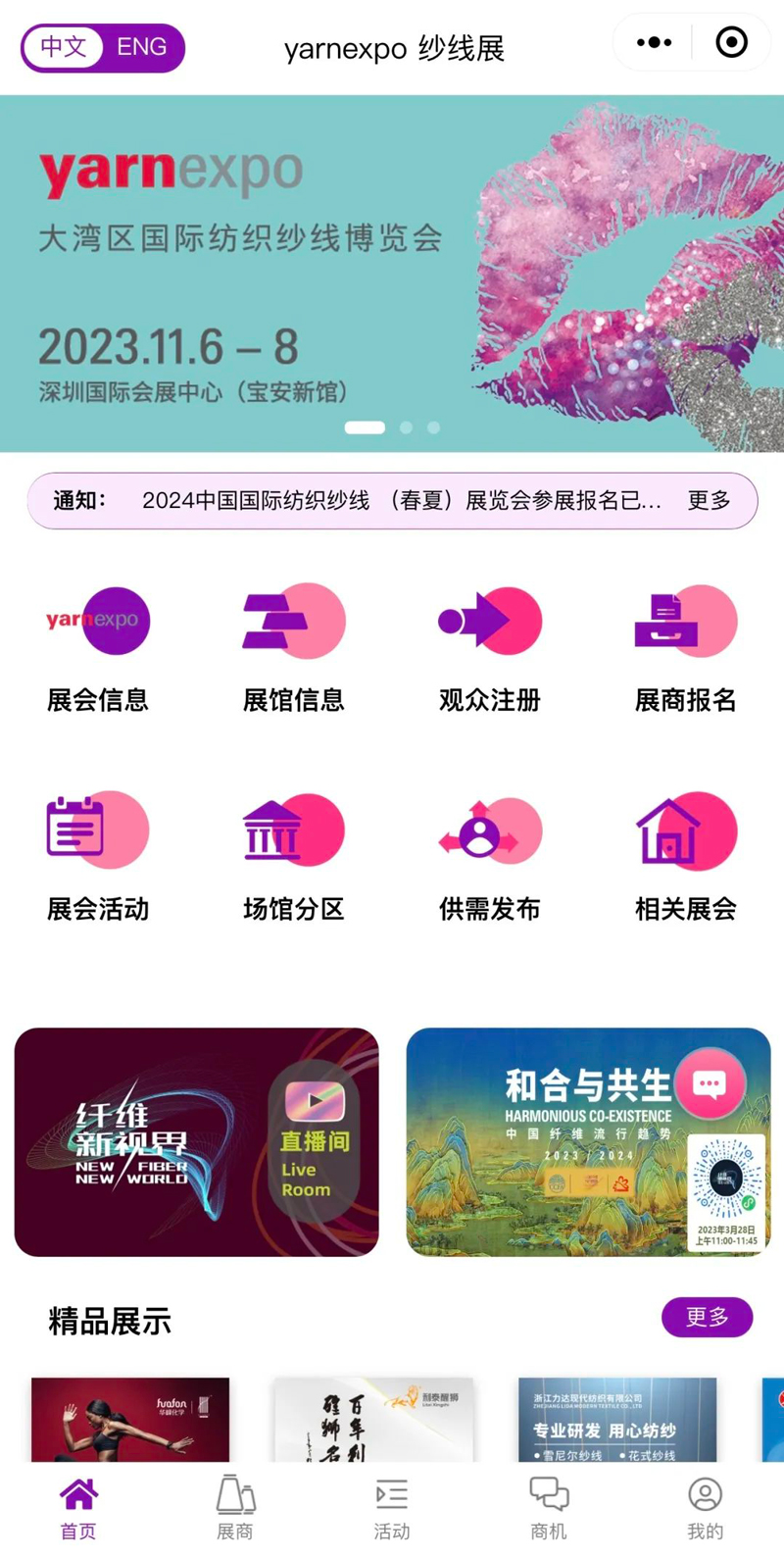 扫码进入“纱线展云展小程序”,同步呈现流行趋势发布、企业新品发布、高端论坛、直播逛展等精彩线下活动。纱线展实体展展商登录云展小程序后台,实时维护企业产品,与客户分享线上专属精品展位,查看供需信息,获得数字化参展新体验。