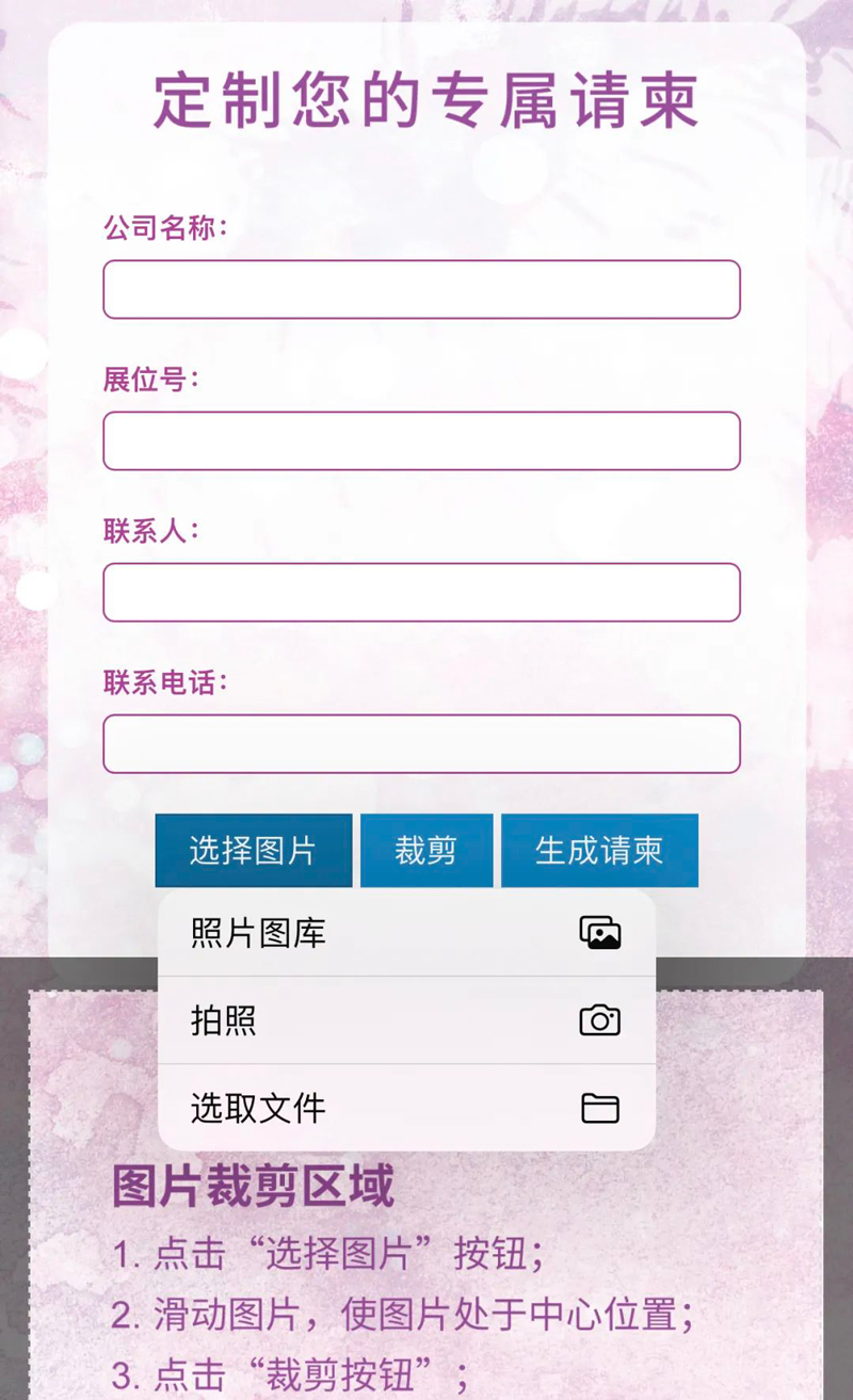 按照要求填写公司名称及展位号、联系人等相关信息,并上传产品图片,点击“生成请柬”按钮。