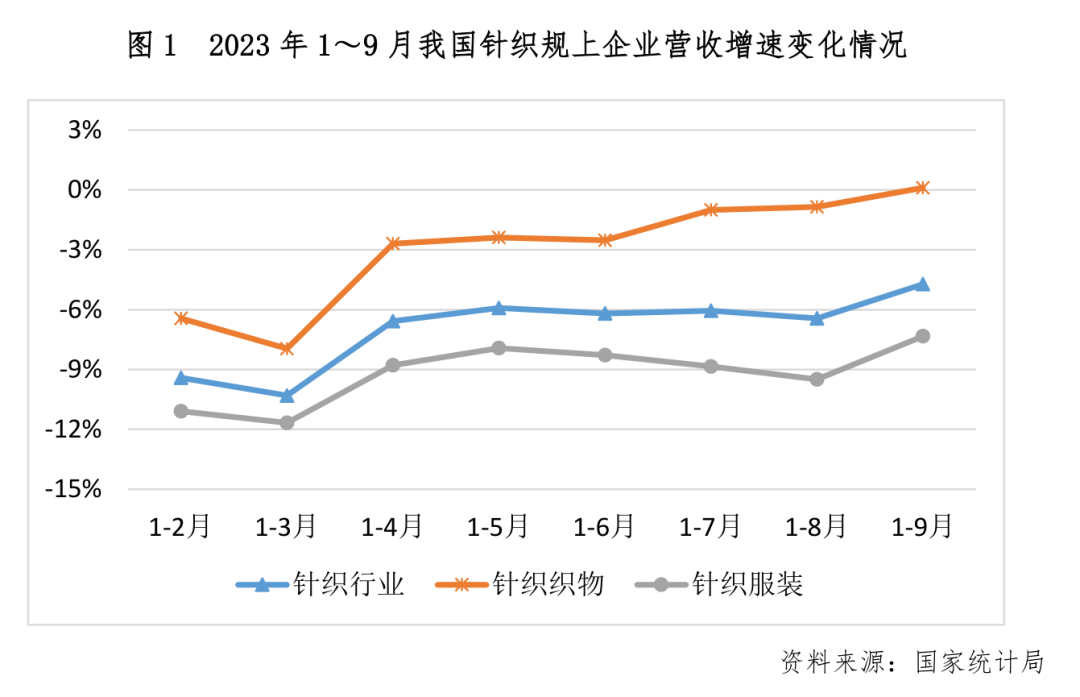行业营收,较今年上半年略有好转。1~9月针织行业规上企业主营业务收入同比下降4.72%,降幅较上半年收窄1.47个百分点。其中,针织织物规上企业营业收入同比微增0.11%,较上半年提高2.63个百分点;针织服装规上企业营业收入同比下降7.33%,降幅较上半年收窄0.95个百分点。