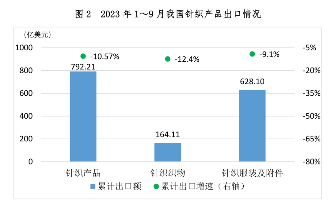 1~9月,我国针织产品出口792.21亿美元,同比下降10.57%,降幅较上半年扩大0.32个百分点。其中,针织织物出口164.11亿美元,同比下降12.4%;针织服装及附件出口628.10亿美元,同比下降9.1%。9月当月,我国针织产品出口同比下降3.54%,环比降幅大幅收窄。
