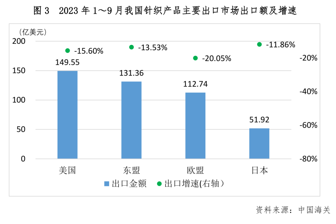 从主要出口市场来看,我国针织产品对几大出口目的国的出口额依旧保持收缩态势,降幅与上半年基本持平。