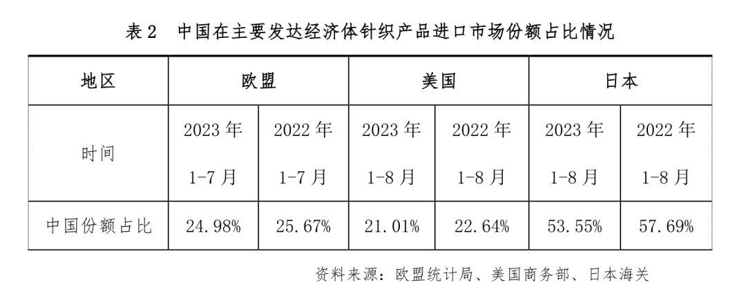 从市场份额来看,今年以来,主要发达经济体如美国、欧盟等对针织产品的进口需求均有所下降,同时我国产品在上述市场中的份额占比也有所减少。1~7月欧盟针织产品进口额同比下降12.55%,其中对我国进口同比下降14.89%;1~8月美国针织产品进口额同比下降27.71%, 其中对我国进口同比下降32.93%;1~8月日本针织产品进口额同比增长1.52%,其中对我国进口同比下降4.15%。