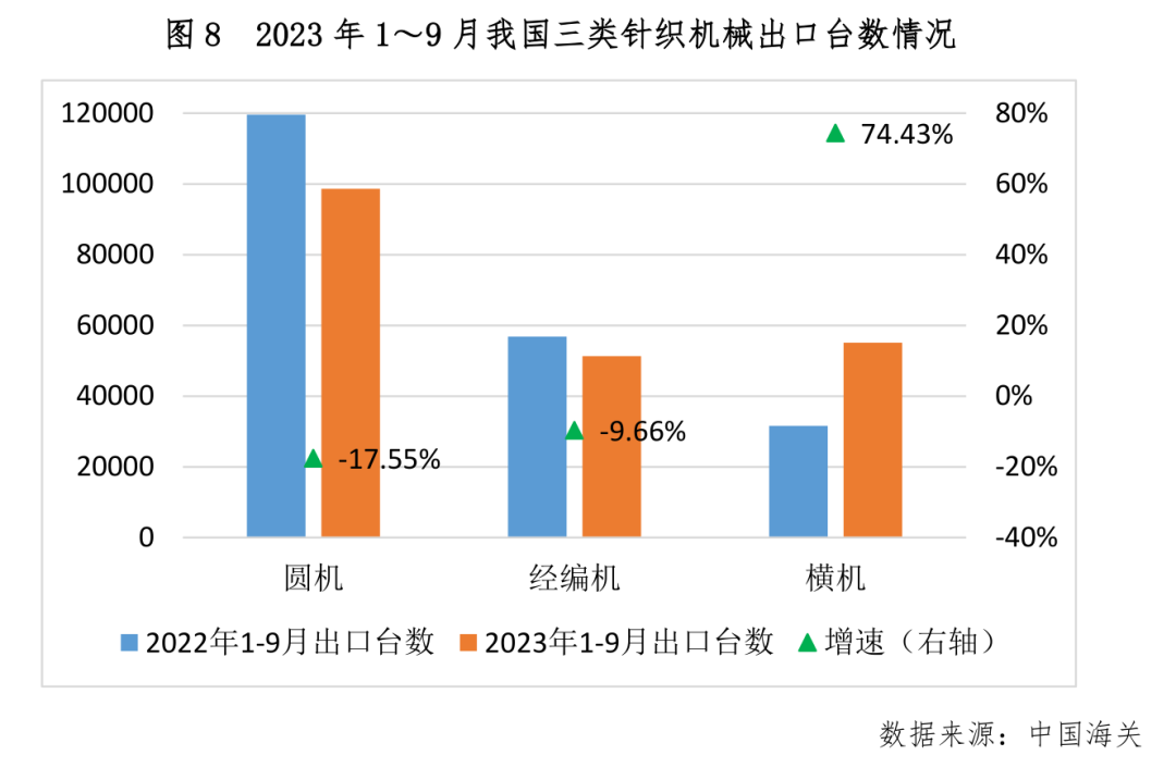 另据中国海关数据,1~9月我国圆机、经编机分别出口98000余台和51000余台,同比分别下降17.55%和9.66%;同期,横机的出口数量为55000余台,同比大幅上扬74.43%。从出口分布情况来看,印度、越南、孟加拉、土耳其等为我国针织机械的主要出口目的国,该四国的占比之和约占我国针织机械出口总额的50%。