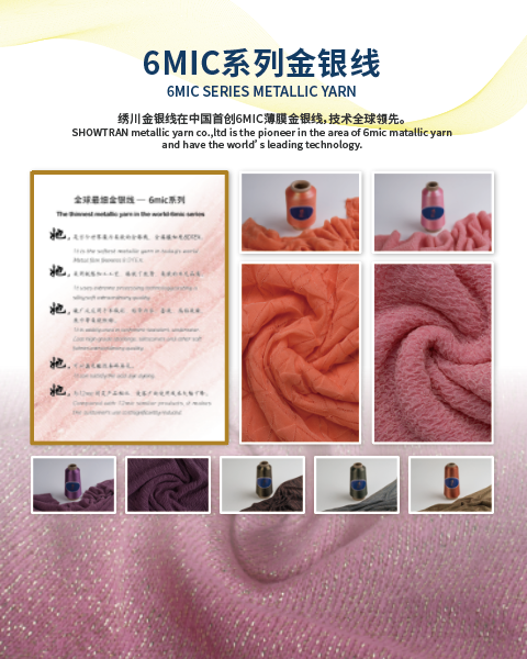 1、6MIC系列  内衣用金银线 绣川金银线在中国首创6MIC薄膜金银线,技术全球领先,应用于贴身内衣、羊绒衫、高档丝巾等产品,不仅丝滑、柔软,还大幅降低了客户的使用成本。