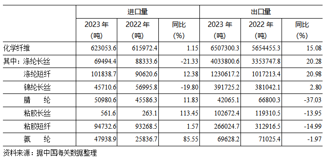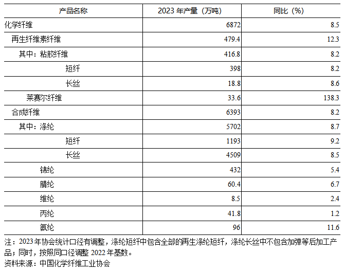 根据中国化纤协会统计,2023年化纤产量为6872万吨,同比增长8.5%(表1)。其中, 莱赛尔纤维产量33.6万吨,同比大幅增加138.3%;氨纶产量96万吨,同比增加11.6%;涤纶产量5702万吨,同比增加8.7%。
