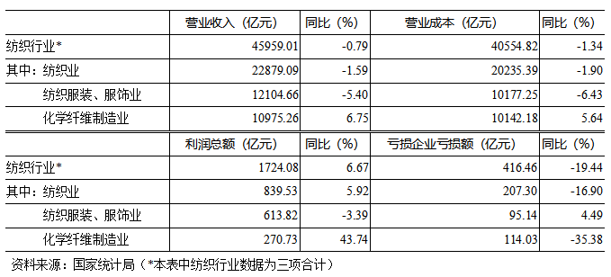 2023年化纤行业经济效益指标呈现向好趋势。国家统计局数据显示,化纤行业营业收入为10975.26亿元,同比增加6.75%;自8月起,累计同比增速转正。实现利润总额270.73亿元,同比增加43.74%,自10月起,累计同比增速转正;利润同比大幅增加的原因,一方面是行业经济运行在下半年有很大改善,另一方面很大程度上是因为2022年四季度基数较低。化纤行业为纺织全行业贡献约15.7%的利润,较2022年提升了4个百分点;行业亏损面25.52%,较2022年收窄6.41个百分点,亏损企业亏损额同比减少35.38%(表3)。