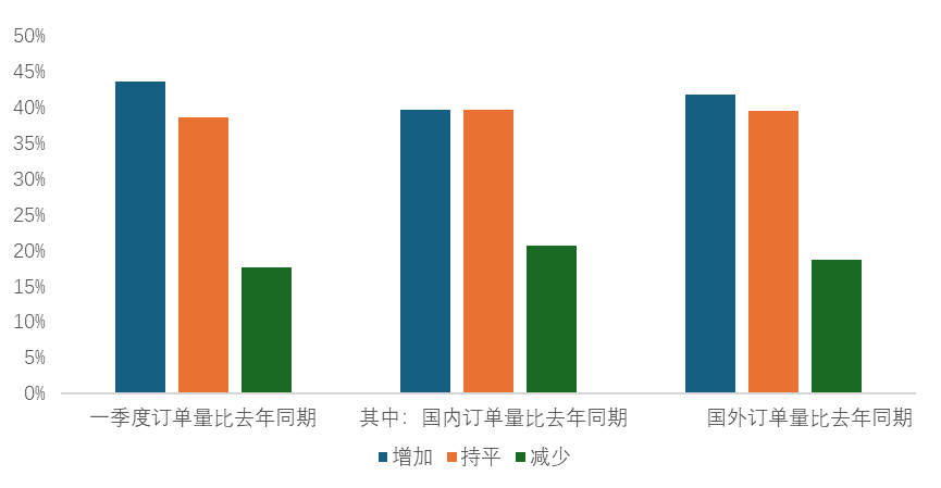 从主要子行业情况看,布艺企业订单表现更为突出。一季度订单同比增加的企业占52.17%,另有41.30%的企业订单保持持平。床上用品企业订单同比增加的占45.45%,持平的企业占34.09%;毛巾企业订单同比增加的占比为28%,与上年同期持平的占39%。