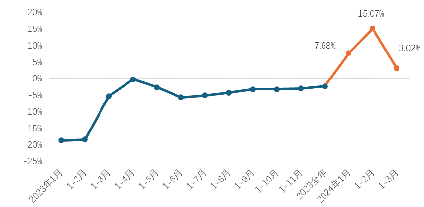 图3. 2023年-2024年一季度我国家纺产品出口额增速