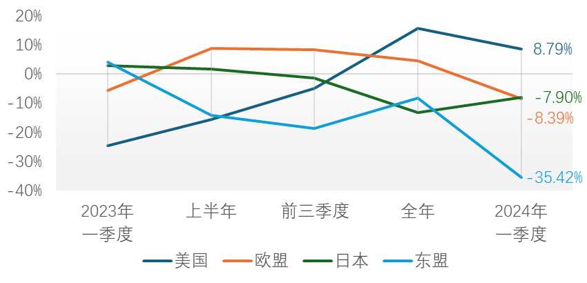 图4. 2023年-2024年一季度我国家纺主要市场出口额增长走势