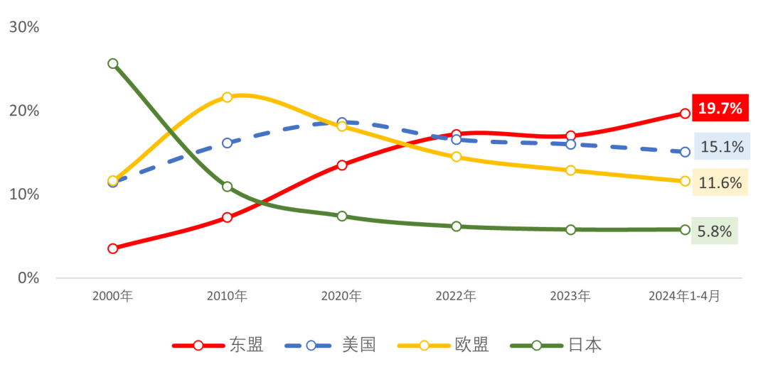 图1 我国纺织品服装主要出口市场占出口额比重变化情况