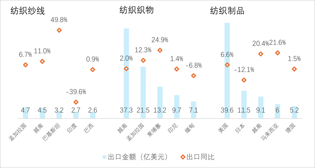 图3 我国对部分主要国家出口纺织纱线、织物及制品统计