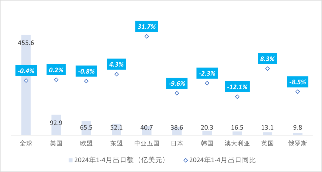 今年1~4月我国对全球出口服装及衣着附件455.6亿美元,同比微降0.4%。其中,我国对美国、东盟、英国等主要市场出口服装金额保持平稳增长,对中亚五国服装出口额同比大幅增长31.7%,特别是对哈萨克斯坦出口增速高达90%。
