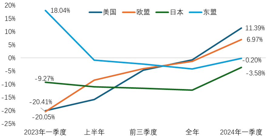 图4. 2023年-2024年一季度我国家纺主要市场出口额增长走势