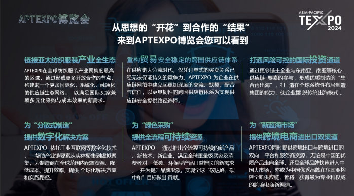 首届亚太纺织服装供应链博览会暨高峰论坛(APTEXPO 2024)汇聚全球纺织服装优秀品牌、供应链领军企业、重量级国际采购商、国际时尚买手、行业智库和政策制定者、各领域优质服务商等,立足现状、放眼未来,共筑亚太产业链务实合作新生态,重构全球纺织服装安全供应链新体系,无限商机待您解锁、共探!