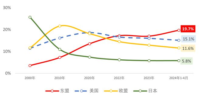 今年1-4月,我国对东盟国家出口纺织品服装176.9亿美元,同比增长6.2%,出口额为2010年以来历史同期最高位,占我国对全球出口纺织品服装总额比重达到19.7%,较2023年同期的18.5%占比进一步提高。