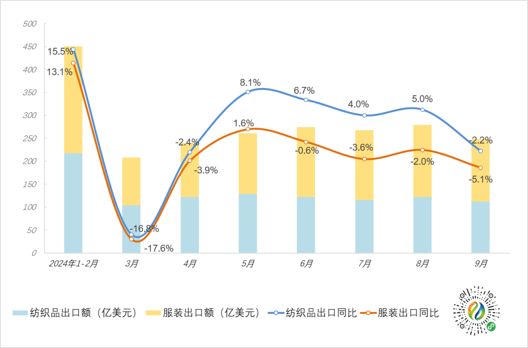 图1 2024年全国纺织品、服装出口月度统计