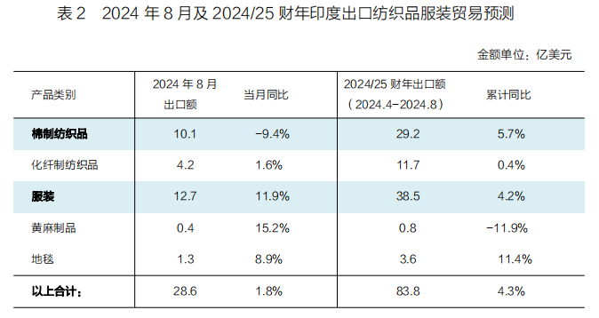 印度商业工业部公布的2024年8月出口预估数据显示,今年8月,印度向全球出口棉制纺织品10.1亿美元,同比减少9.4%;出口服装12.7亿美元,同比增加11.9%。加上化纤制纺织品、黄麻制品以及地毯等产品,印度以上纺织品服装8月出口额共计28.6亿美元,同比增加1.8%。