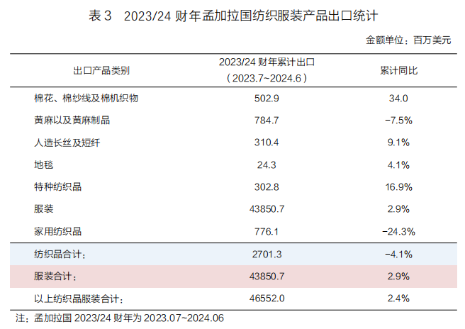 根据孟加拉国服装制造及出口商协会(BGMEA)数据,2023/24财年前11个月(2023.7~2024.5),孟加拉国对全球出口服装438.5亿美元,同比增加2.9%。其中,针织服装出口247.1亿美元,同比增长6.2%;机织服装出口191.4亿美元,同比减少1.1%。同期,孟加拉国对全球出口纺织品27亿美元,同比下降4.1%。