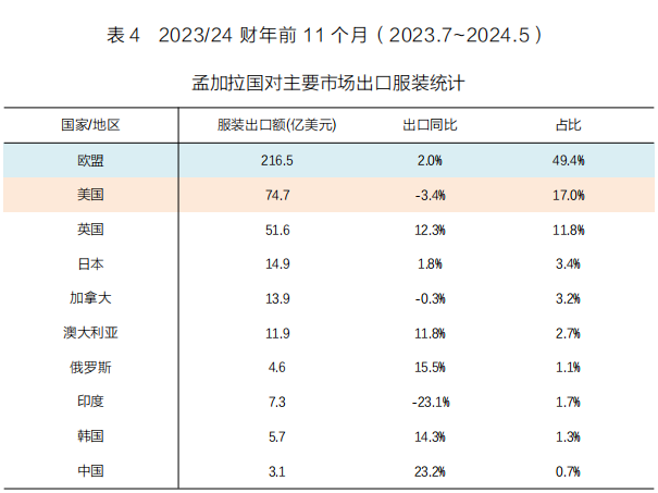 从主要市场看,2023/24财年前11个月孟加拉国对欧盟、英国和澳大利亚等发达经济体市场出口实现较快增长。其中,孟加拉国对欧盟出口服装216.5亿美元,同比增长2%,占对全球出口比重的49.4%;对英国出口服装51.6亿美元,同比上升12.3%,占比11.8%。同期孟加拉国对美国出口服装74.7亿美元,同比减少3.4%,占其服装出口总额的17%;对中国出口服装3.1亿美元,同比增长23.2%,占比0.7%。