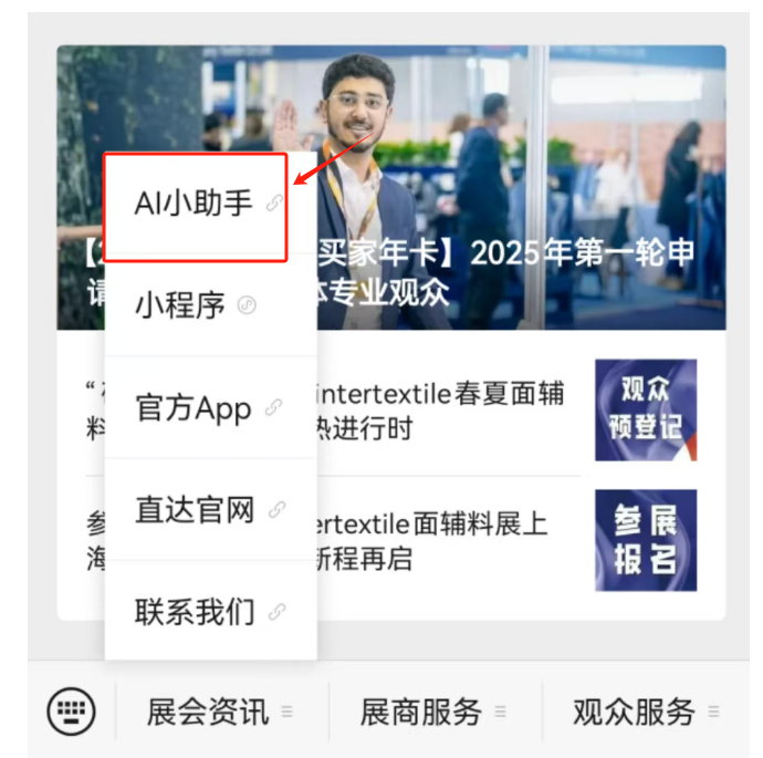 即日起,登录intertextile面辅料展官方网站或关注官方微信公众号、进入“展会资讯”栏,即可体验intertextile面辅料展“AI小助手”快问秒答服务,了解各类参展及观展信息。