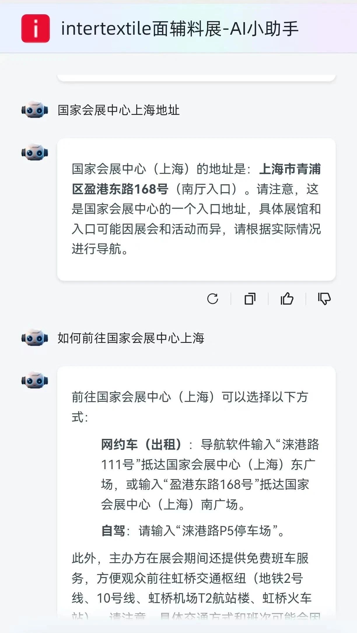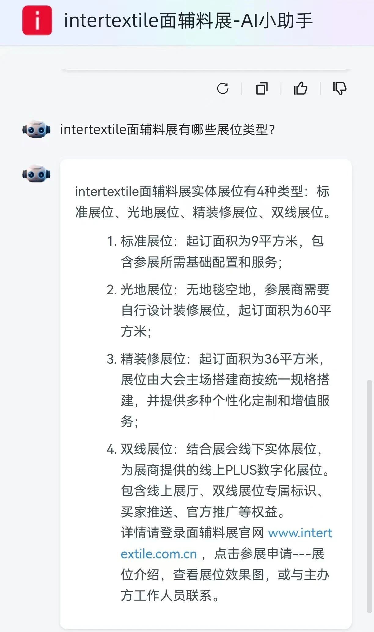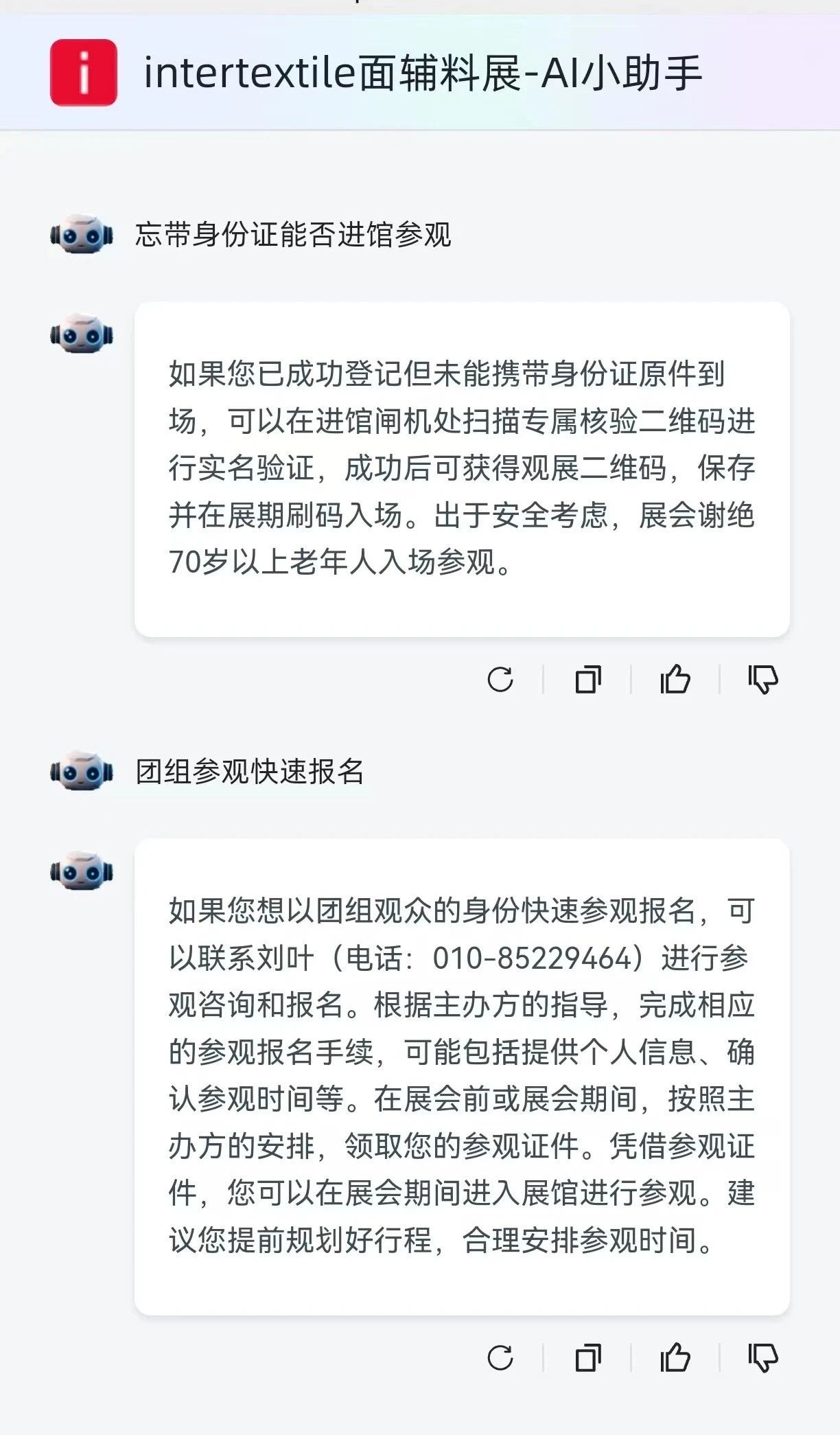 无论您是资深观众还是萌新观众,想要提前了解观展讯息的小伙伴,均可在intertextile面辅料展“AI小助手”对话框输入具体问题或关键词,检索获知相关展会讯息,快问快答,便捷高效!同时,还能get展会最全“观众服务”!