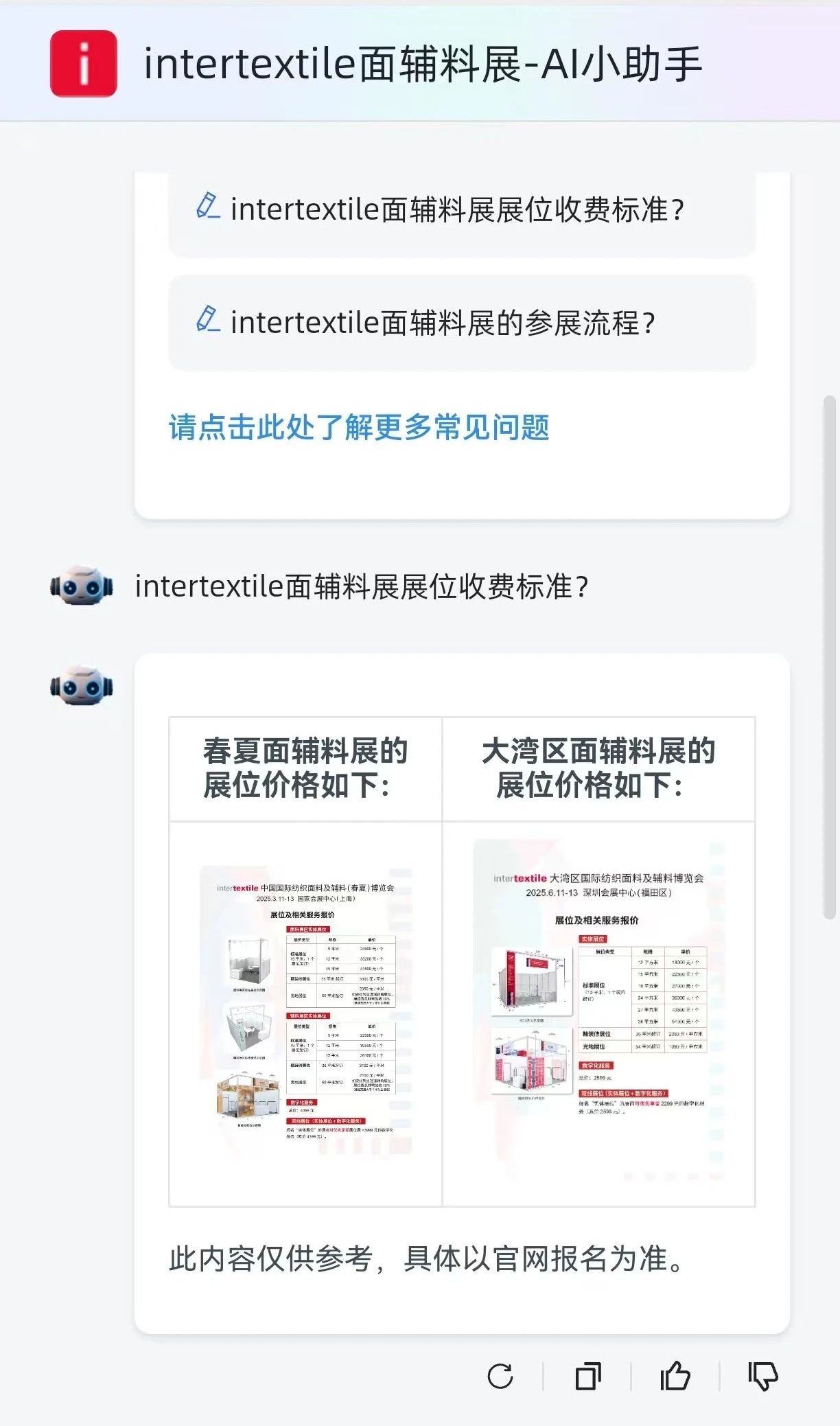 根据历届展会咨询热点问题统计,intertextile面辅料展“AI小助手”罗列新老企业参展常见问题TOP10,并提前进行解答,让您抢先掌握参展必备“知识点”,加入intertextile面辅料展展商阵容不走弯路!