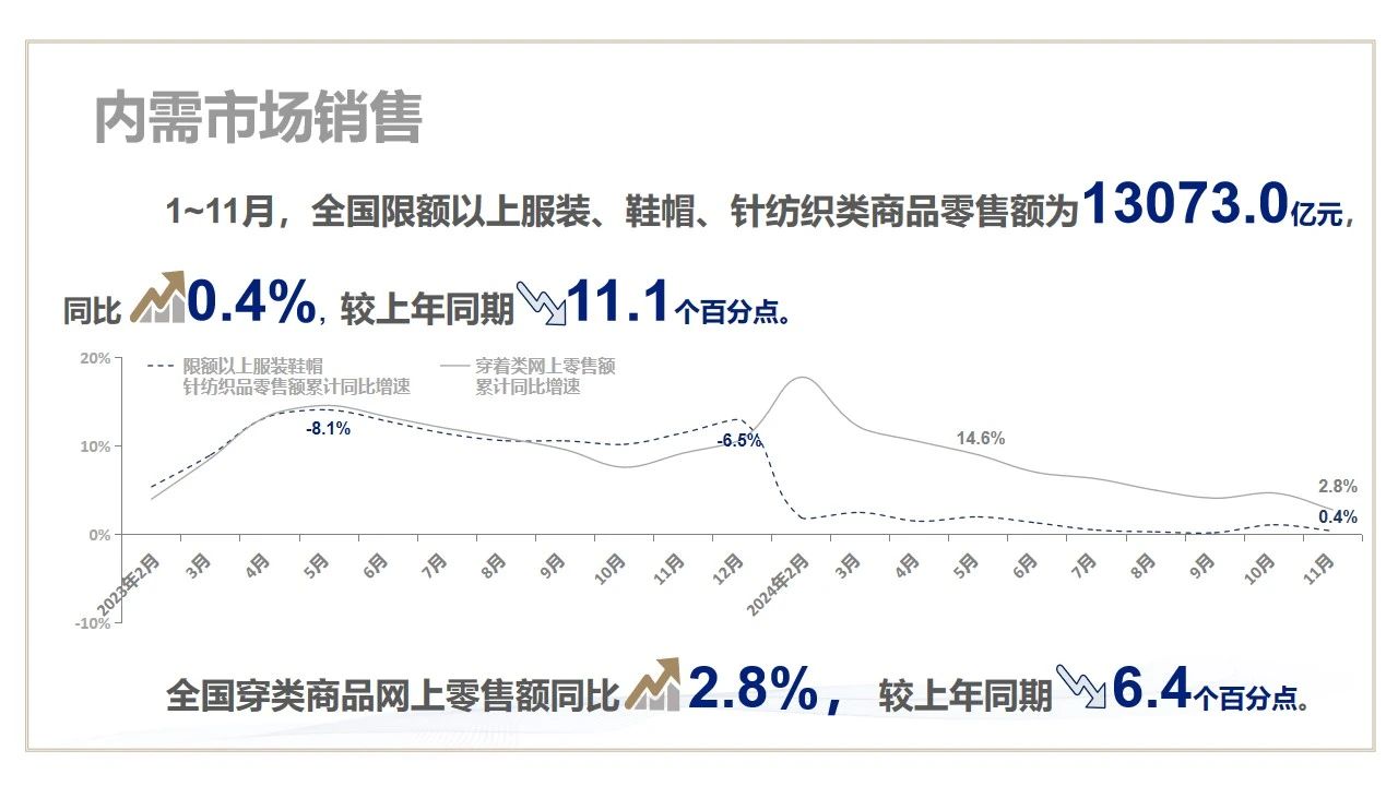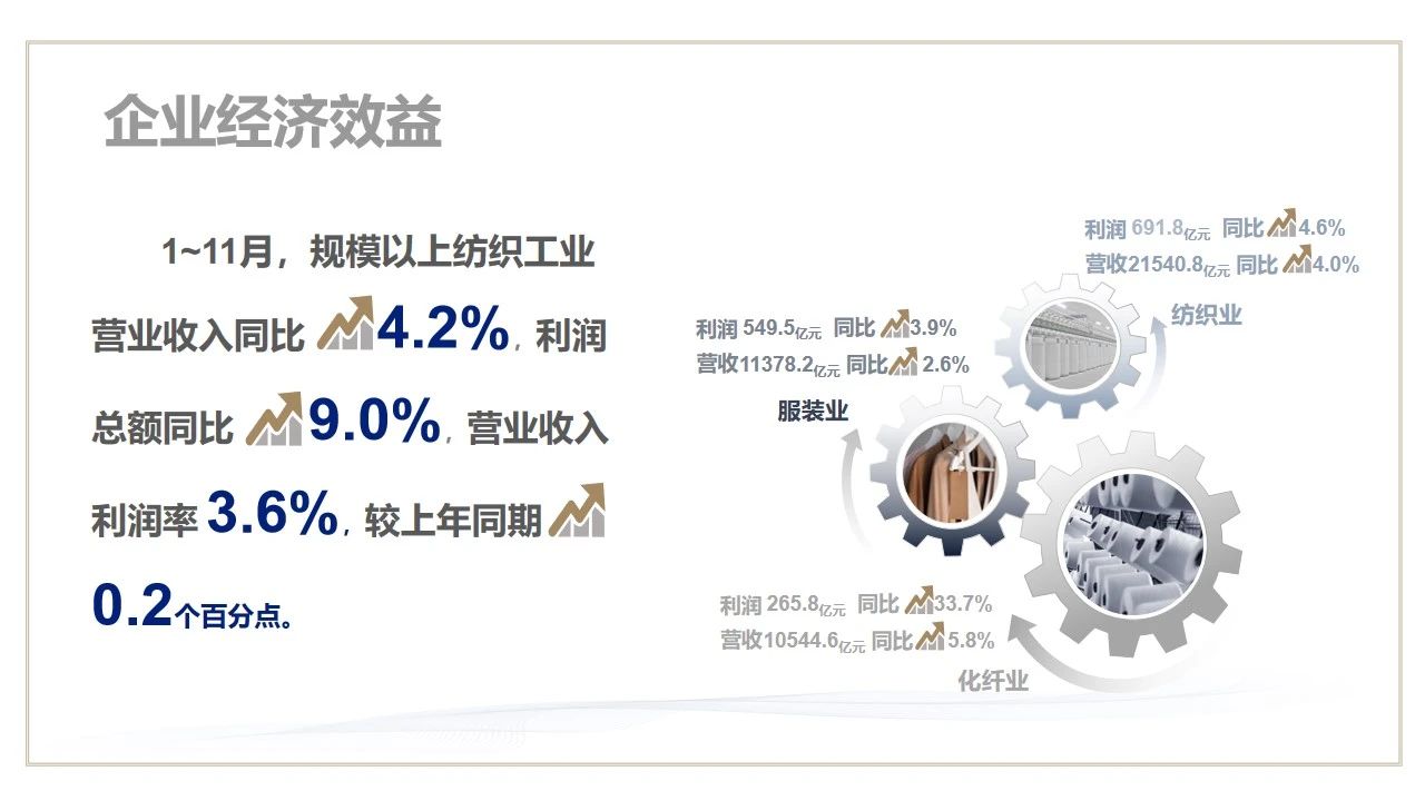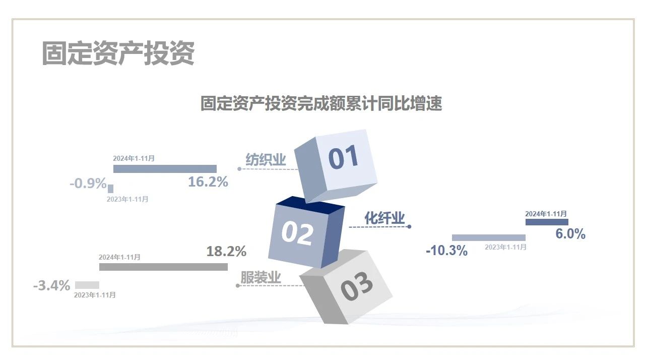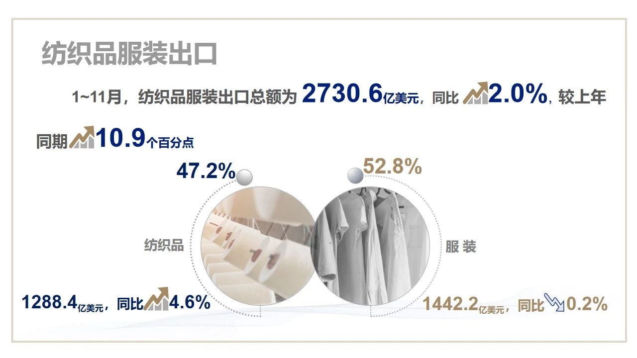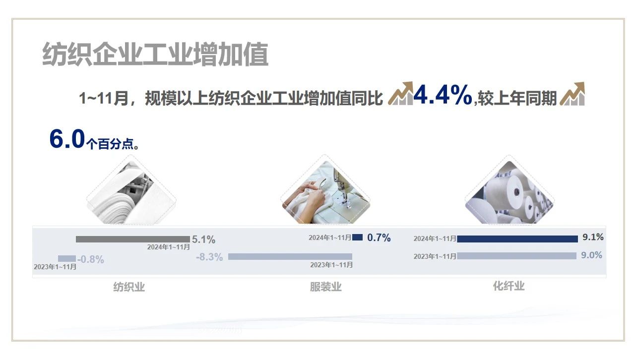 您现在的位置是:首页 > 要闻 “数”说纺织:2024年1~11月 来源:纺织贸促会 发布日期:2025-01-07 字体: 【小】 【中】 【大】 分享: 热门文章: 2025intertextile春夏 | “友礼”同享齐观展... [2025-02-19] 2024年我国纺织行业经济运行总体平稳 [2025-02-17] 聚焦绿色智慧融合 展示产业用纺织品新趋势 [2025-02-11] 响应政策 落实服务 | PH Value义乌展全力“备战”中 [2025-02-11] 【亮星季】第一期正式开启 | 商贸先行,品质好礼享不停 [2025-02-10] 展会直通车