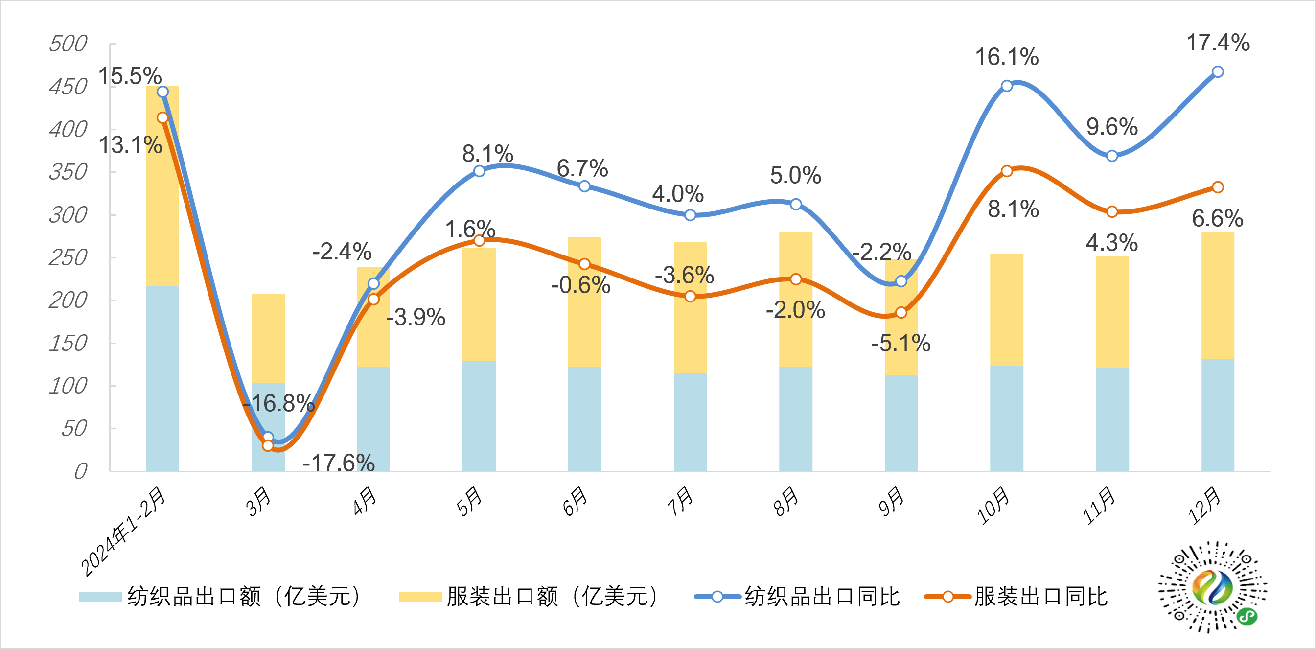 2024年四季度以来,全球通胀压力得到进一步缓解,欧美等海外市场需求有所回暖,叠加去年同期基数较低、外贸企业为应对特朗普就任美国总统后贸易政策的不确定性抢出口等多重因素影响,纺织行业12月出口额明显回升。12月当月,我国纺织品服装出口额为280.7亿美元,同比增长11.4%。其中,纺织品出口额为131.3亿美元,同比增长17.4%;服装出口额为149.3亿美元,同比增长6.6%。