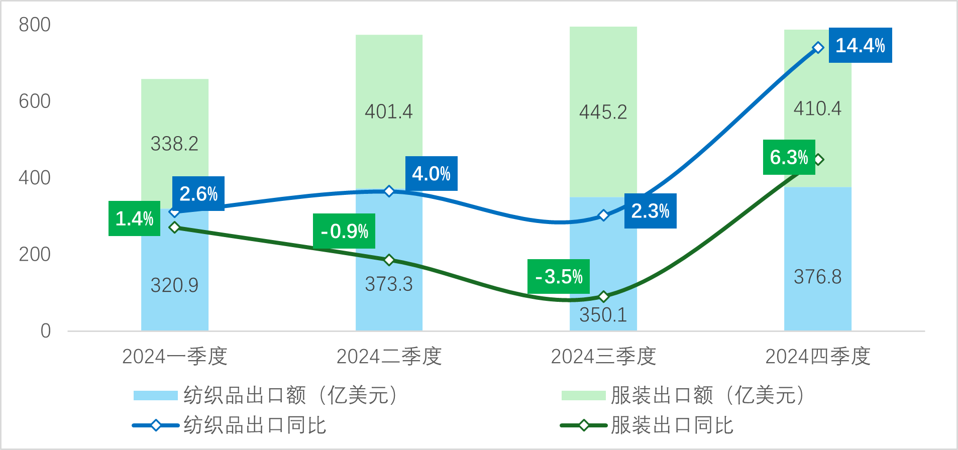 我国纺织行业在复杂外部形势下,坚持深化转型升级,不断提升发展韧性,总体上有效化解了需求疲弱、竞争加剧等风险挑战,出口贸易实现平稳增长。2024年一至四季度,我国纺织品出口额均保持在正增长区间,四季度出口额增幅较三季度扩大12个百分点;服装出口增速呈U形波动,二季度出口增速由正转负,四季度之后逐渐回暖企稳。