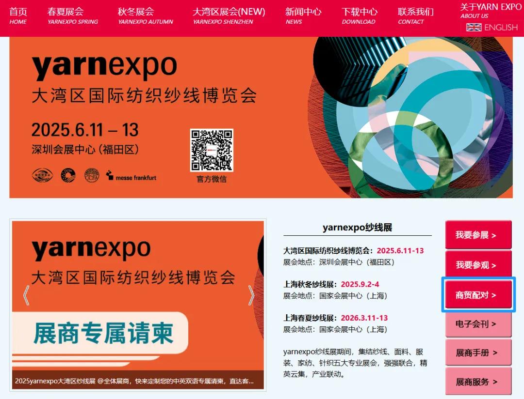 只要您有采购纤维纱线产品意向,希望快速找到心仪的产品,便可通过主办方【商贸配对】预约服务系统进行申请。