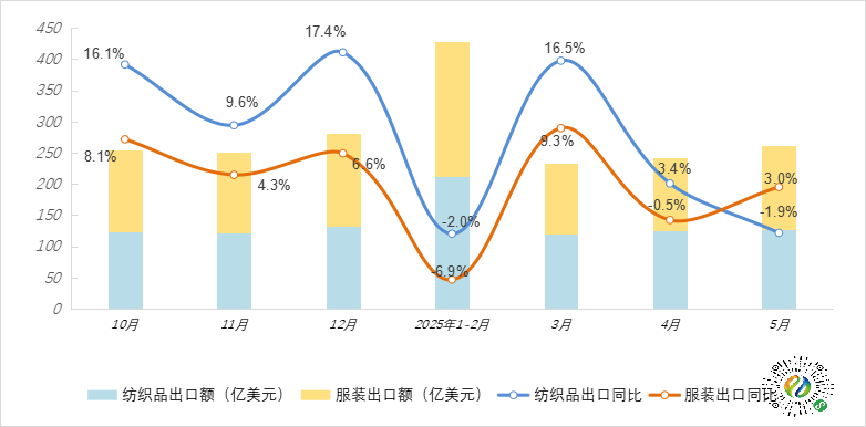 图1 2024~2025年全国纺织品、服装出口月度统计