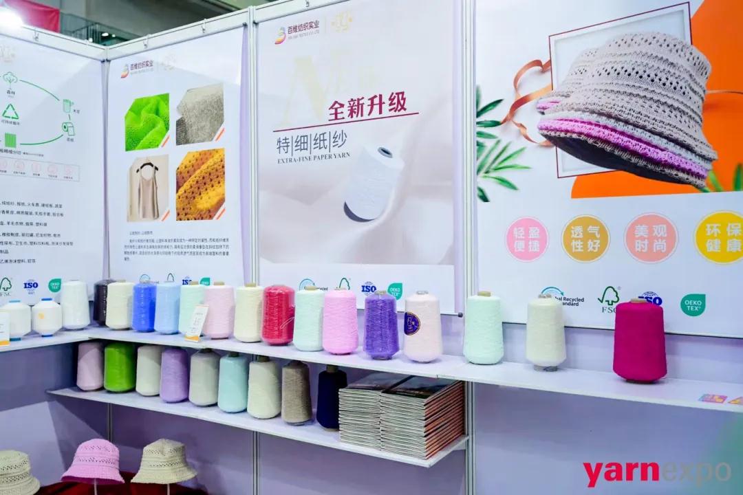 公司成立于2010年,主要生产纸纱及其深度加工产品,如单股加捻纸纱,多股复合花式纱等,展会上也重点展示了纯纸纱(100%纸)以及混纺纸纱(20-60%纸)。据介绍,和纸纱是属于天然环保纤维材质范畴,安全、卫生;可快速堆肥降解,最快仅2周,降解时无毒产生,具备高度可持续性。和纸纱是一种轻盈柔软的材料,质地非常轻盈,手感柔软舒适重量仅为棉重的1/3;它的独特之处在于融合了和纸的纯净和丝线的光泽,给人一种雅致、清新的感觉,适用于春夏服饰。
