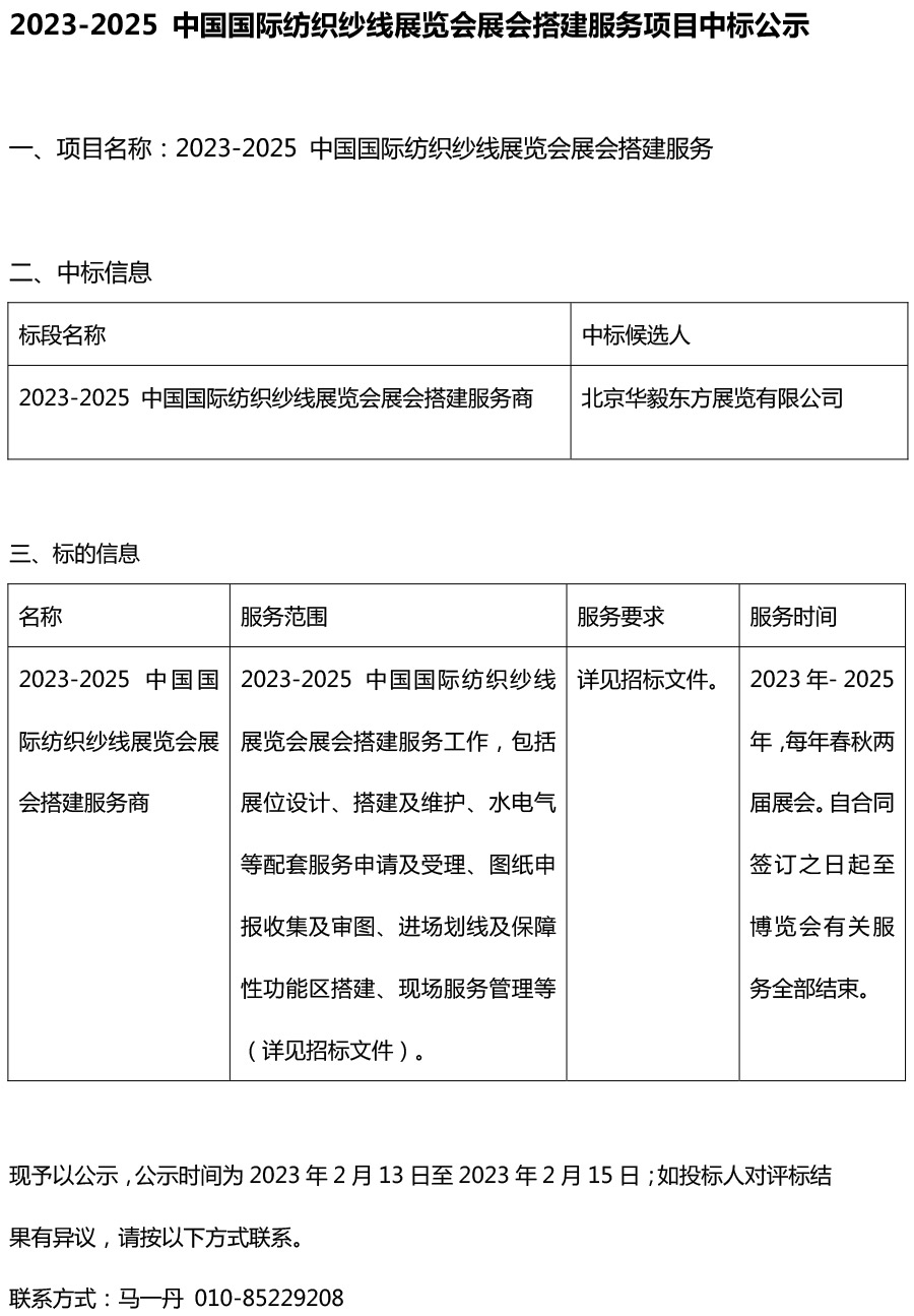 您现在的位置是:首页 > 最新公告 2023 - 2025 中国国际纺织纱线展览会展会搭建服务项目中标公示 来源:纺织贸促会 发布日期:2023-02-13 字体: 【小】 【中】 【大】 分享: 热门文章: 2025intertextile春夏 | “友礼”同享齐观展... [2025-02-19] 2024年我国纺织行业经济运行总体平稳 [2025-02-17] 聚焦绿色智慧融合 展示产业用纺织品新趋势 [2025-02-11] 响应政策 落实服务 | PH Value义乌展全力“备战”中 [2025-02-11] 【亮星季】第一期正式开启 | 商贸先行,品质好礼享不停 [2025-02-10] 展会直通车