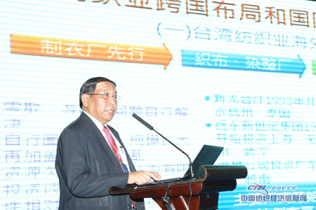 在这边向大家汇报一下台湾纺织业在过去这些年,我们走过的一些途径,我相信是值得大家参考的。今天报告的内容,大家都有资料,我们纺织业对于海外投资的脉络,跨国布局和国际化管理的现状经验,还有对大陆企业走出去的策略提供一个建议。