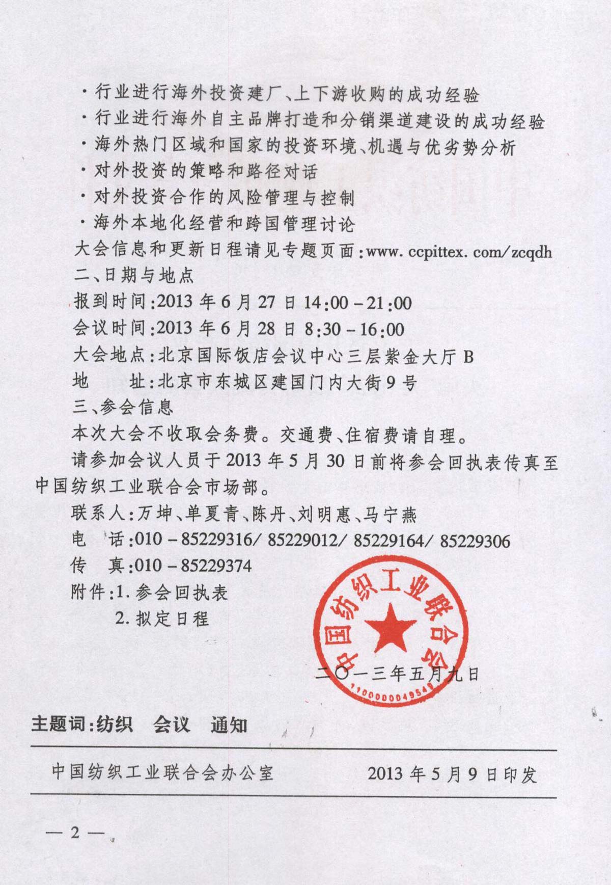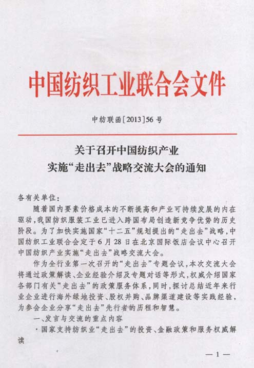 3.中纺联文件:关于召开中国纺织产业实施“走出去”战略交流大会的通知 |